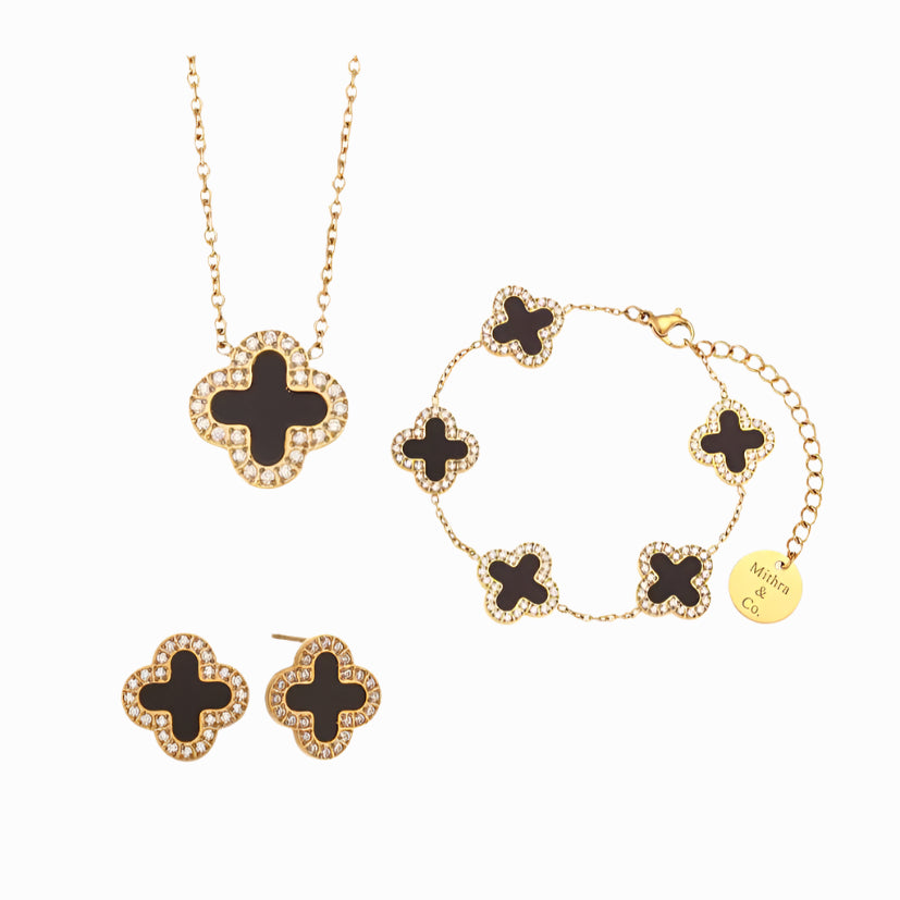 This clover-style set is described as elegant and petite, with a clover motif that is bejeweled with high-quality zircon for a luxurious appearance. It is made with stainless steel and plated with 18k gold for durability.
